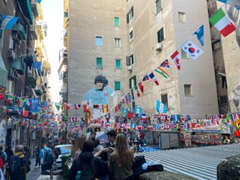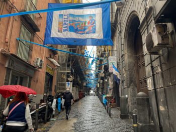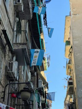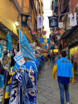 La segunda vez que la visité fue, paradójicamente, después de que Nápoles saliera campeón del Scudetto luego de 30 años (la última vez había sido nada más ni nada menos de la mano de Diego). La ciudad estaba toda celeste, con banderines, banderas, imágenes de los jugadores, y por supuesto del último ídolo. Todo era celeste y se percibía en el ambiente un clima de fiesta que parecería no tener fin.