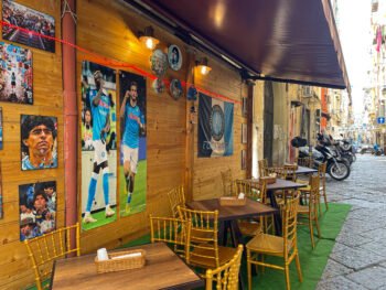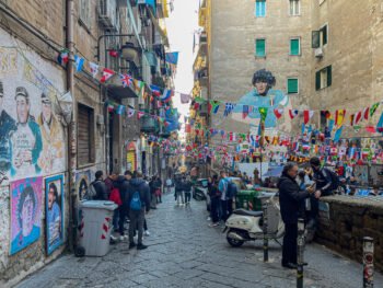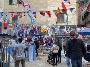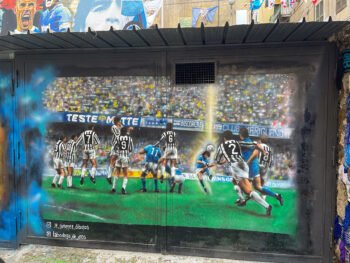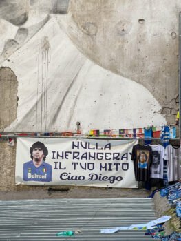 En la última visita, la cuadra, como todo el barrio, estaba decorado con los colores del Napoli, varios carteles haciendo alusión al campeonato y al nuevo ídolo, pero siempre con Maradona presente. Es que lejos de olvidarlo lo tienen más presente que nunca, dedicaron el triunfo a él y también lo hacen un poco responsable. Creo que pasarán 200 años y lo seguirán amando los hijos de los hijos que lo vieron jugar. Es que Maradona les dio 2 Scudetto, Copa UEFA, Coppa Italia y una Supercopa Italiana. Y habrá a quién no le importe el fútbol, pero a los napolitanos sí les importa y lo expresan, como todo, en su máximo nivel.